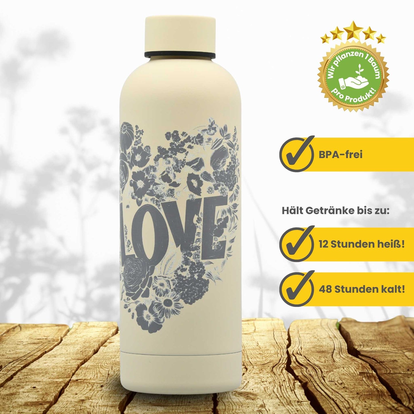 Gefertigt aus hochwertigem 18/8-Edelstahl, eliminiert die isolierte Konstruktion die Bildung von Kondenswasser an der Flasche. Sie ist BPA-frei und entspricht den strengen Anforderungen des deutschen Lebensmittelrechts (LFGB). Mit einem Fassungsvermögen von 500 ml ist sie der ideale Begleiter für Unterwegs. Die Flasche kommt in einer Geschenkbox aus Recyclingkarton.