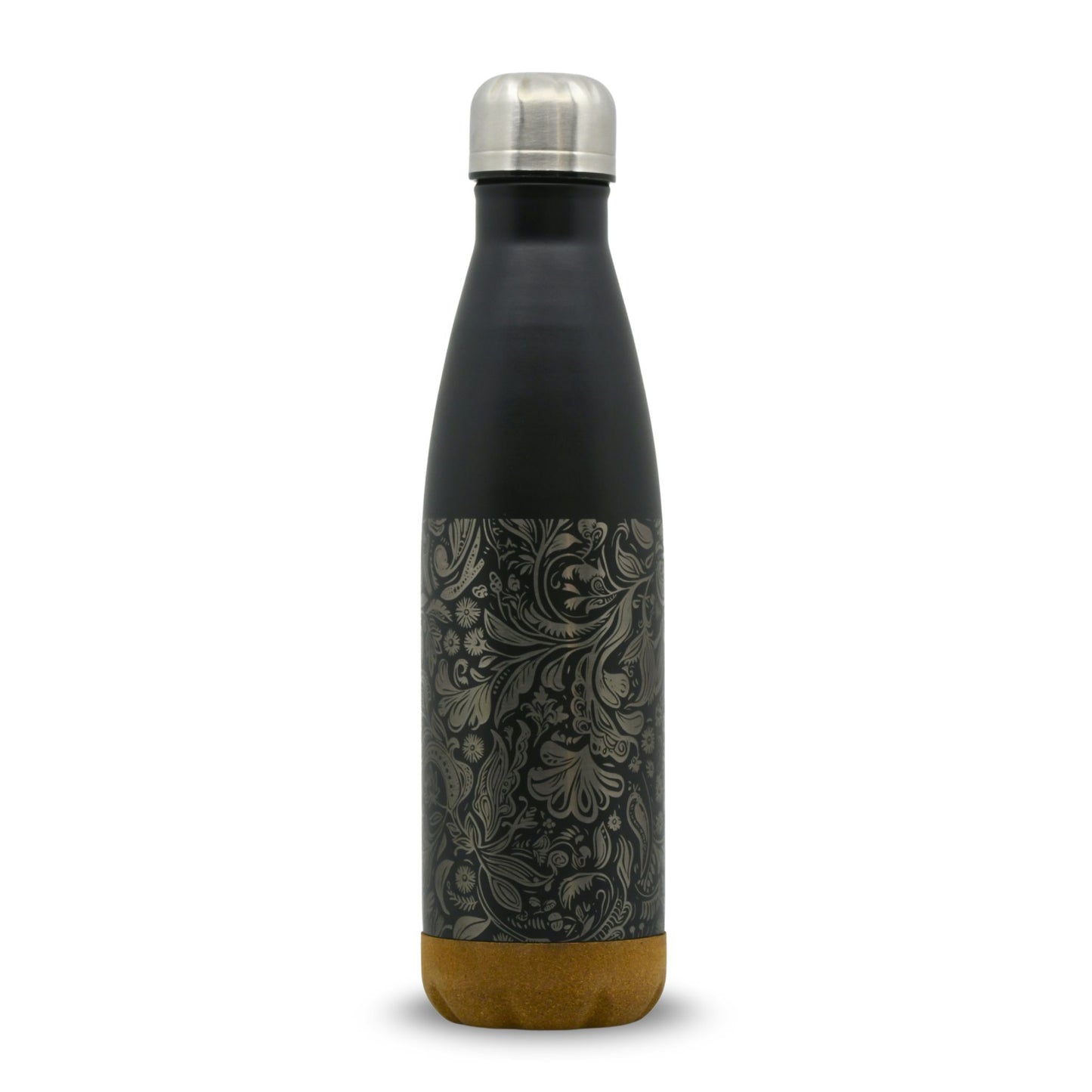 Doppelwandige Isolierflasche aus Edelstahl mit abgesetztem Boden aus Kork. Füllmenge: 500 ml. Auslaufsicher.