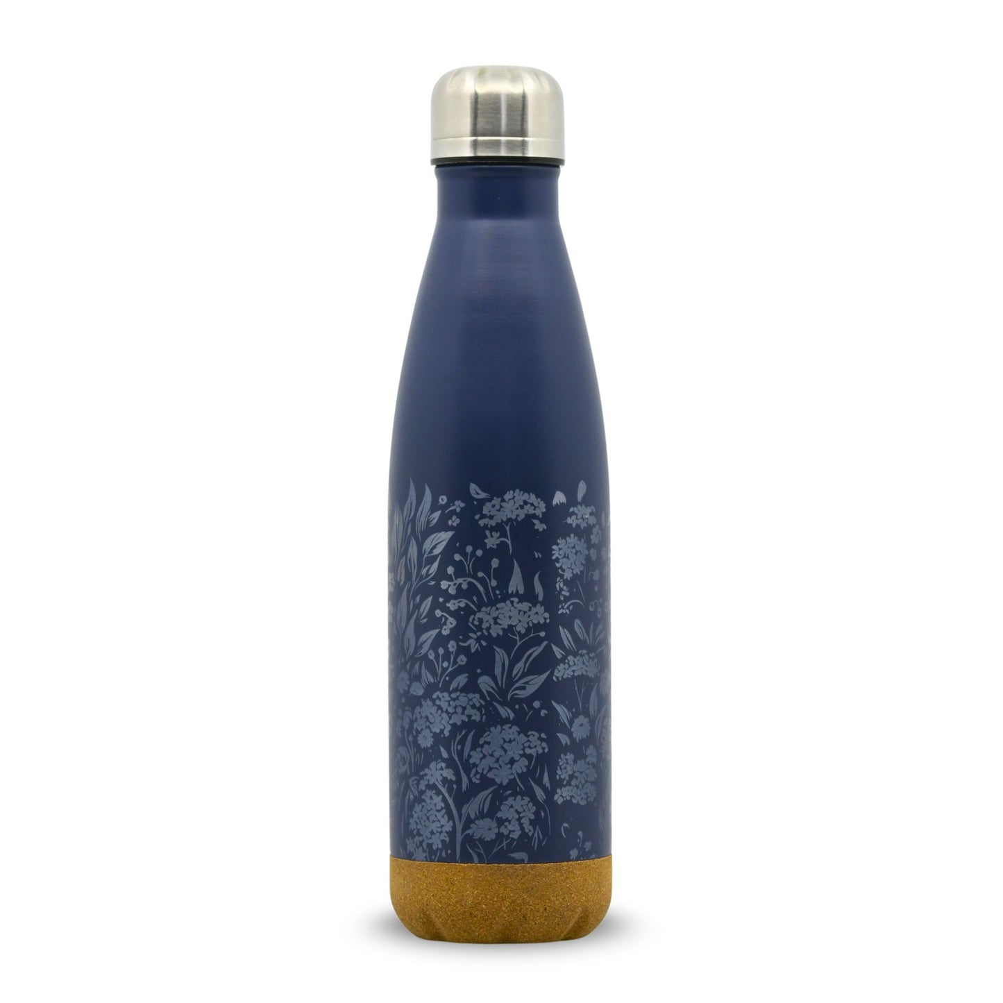 Doppelwandige Isolierflasche aus Edelstahl mit abgesetztem Boden aus Kork. Füllmenge: 500 ml. Auslaufsicher.